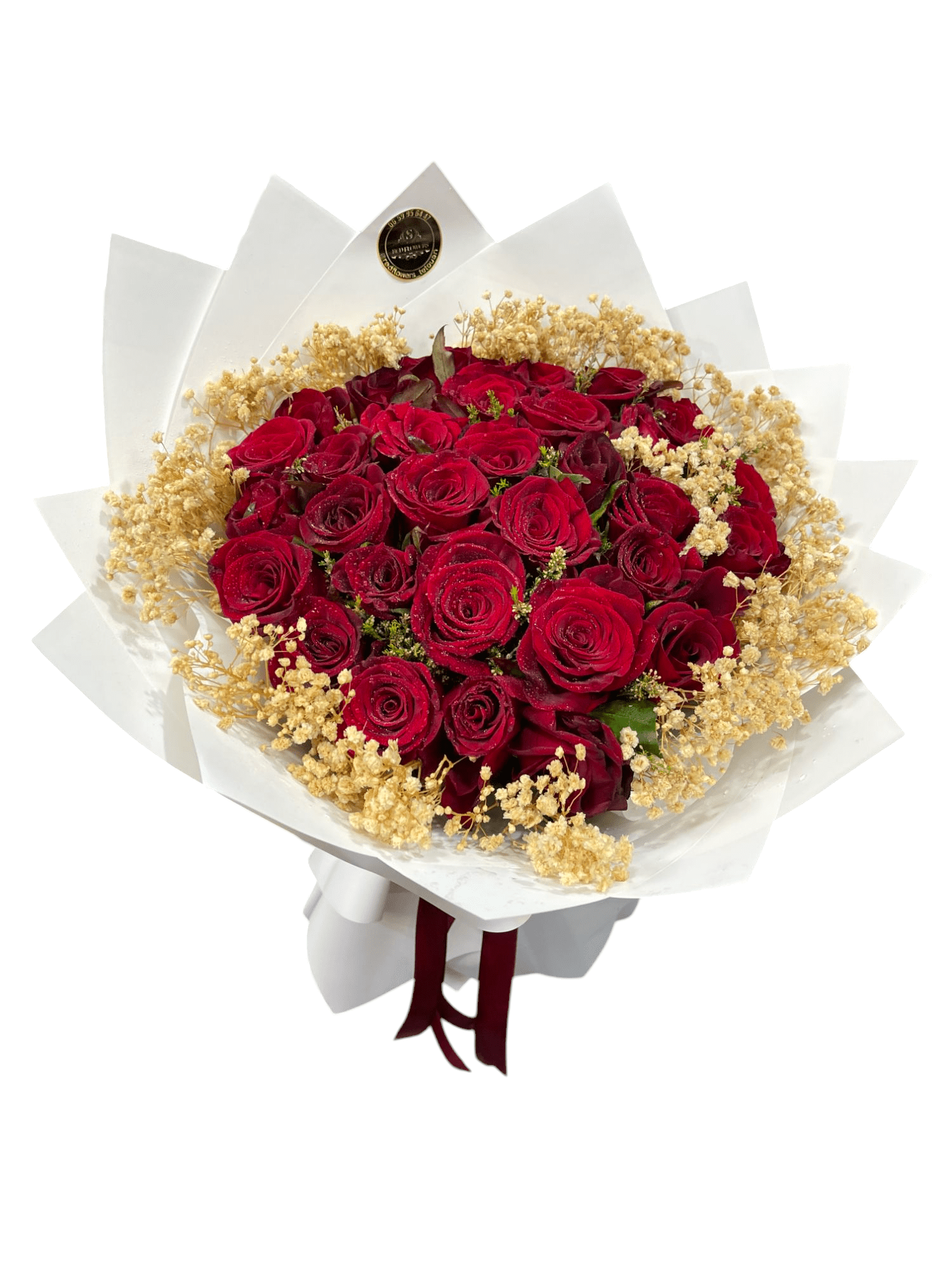 Un bouquet éclatant qui allie la force de la passion et la chaleur de la lumière. Au centre, des roses rouges profondes expriment un amour intense et sincère. Elles sont délicatement entourées de petites fleurs jaune doré, comme un halo lumineux qui illumine l’ensemble. Cette composition rayonne d’énergie et de romantisme, parfaite pour célébrer une histoire d’amour vibrante ou offrir un message plein de chaleur et de joie.