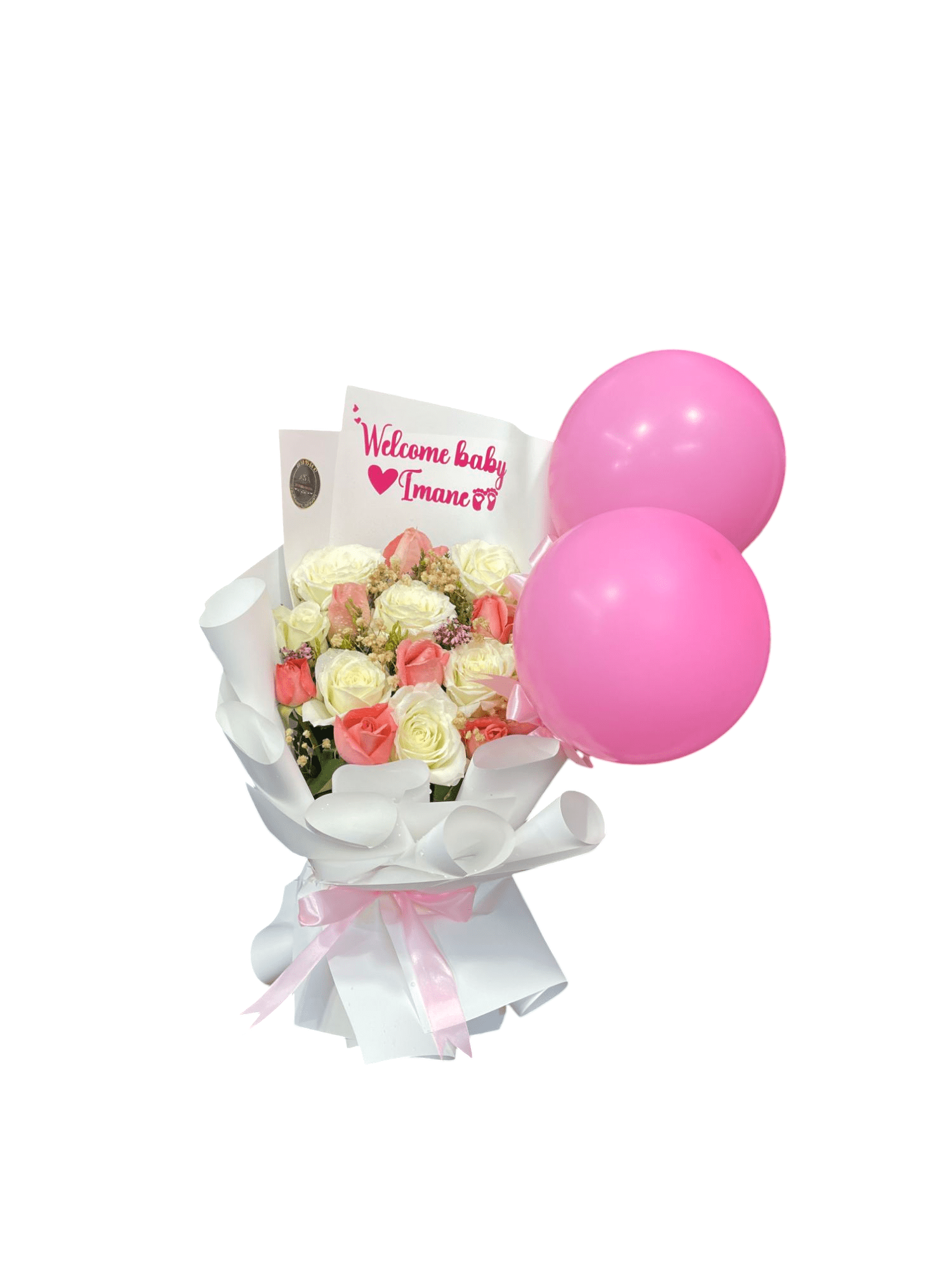 Un bouquet vibrant de roses roses, blanches et orange, symbolisant l’amour, la pureté et la joie de vivre. Les deux ballons roses ajoutent une touche festive et légère, comme un souffle de bonheur dans l’air. Parfait pour célébrer une occasion spéciale, apporter de la gaieté à une journée ou simplement transmettre un message d’affection et de joie.