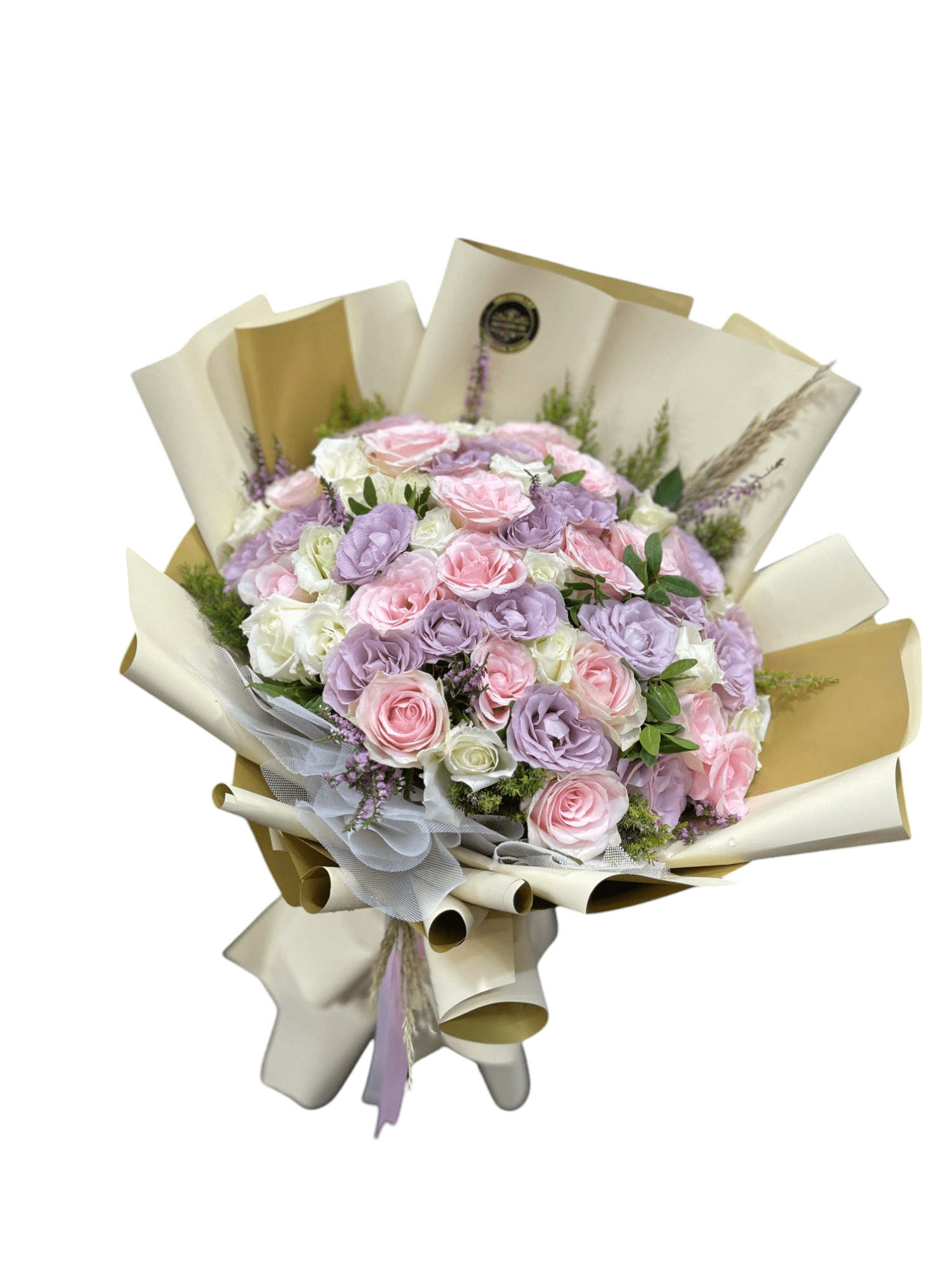 Un bouquet doux et poétique qui évoque la tendresse et la sérénité. Les roses blanches symbolisent la pureté et l’innocence, les roses roses expriment la douceur et l’affection, tandis que les roses bleu ciel apportent une touche de rêve et de mystère. Une composition élégante et apaisante, parfaite pour un cadeau plein de délicatesse ou pour célébrer un moment unique avec élégance.