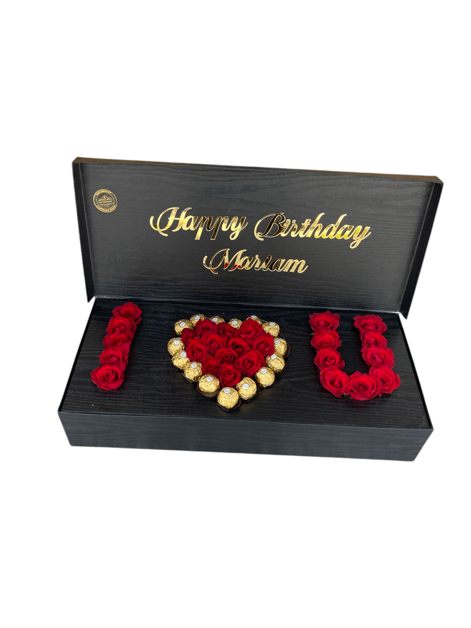 Une élégante boîte noire, au design raffiné et moderne, idéale pour offrir un cadeau spécial. Sur le dessus de la boîte, un message doré en lettres cursives scintille : ‘Joyeux anniversaire’, ajoutant une touche de luxe et de sophistication. À côté de ce mot, un délicat ‘I Love You’ en rouge passionné, délicatement inscrit avec une touche florale, rappelle la beauté et l’intensité des sentiments. Cette boîte, à la fois chic et pleine d’émotion, contient des fleurs et des roses d’une qualité irréprochable, parfaites pour faire plaisir et célébrer un moment unique.