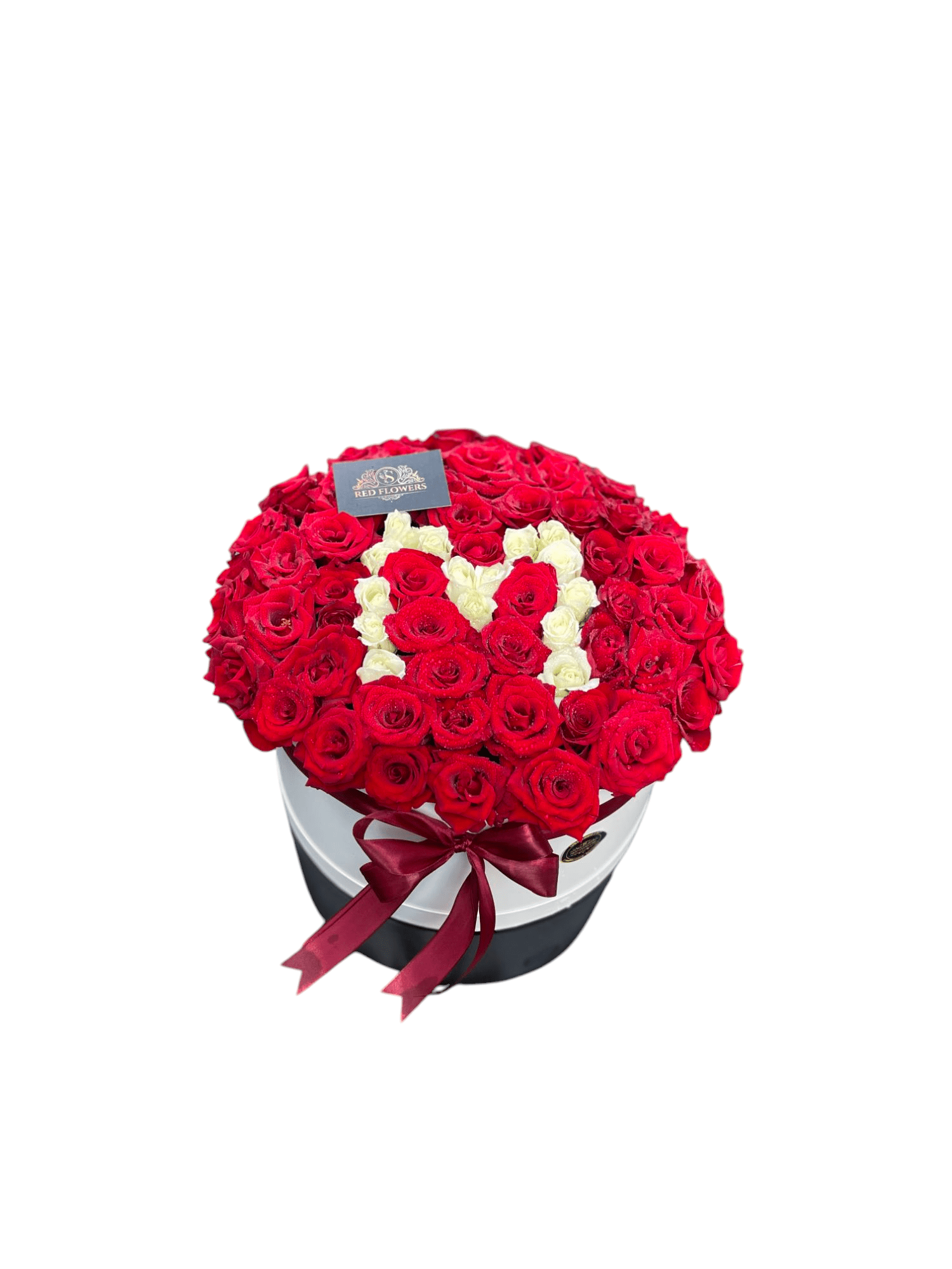 Offrez un message fleuri, simple et fort. Lettre d’Amour est un bouquet rond élégant, composé d’un fond blanc raffiné, sur lequel se dessinent de magnifiques roses rouges, avec en son centre une lettre de l’alphabet en roses blanches, selon votre choix.
